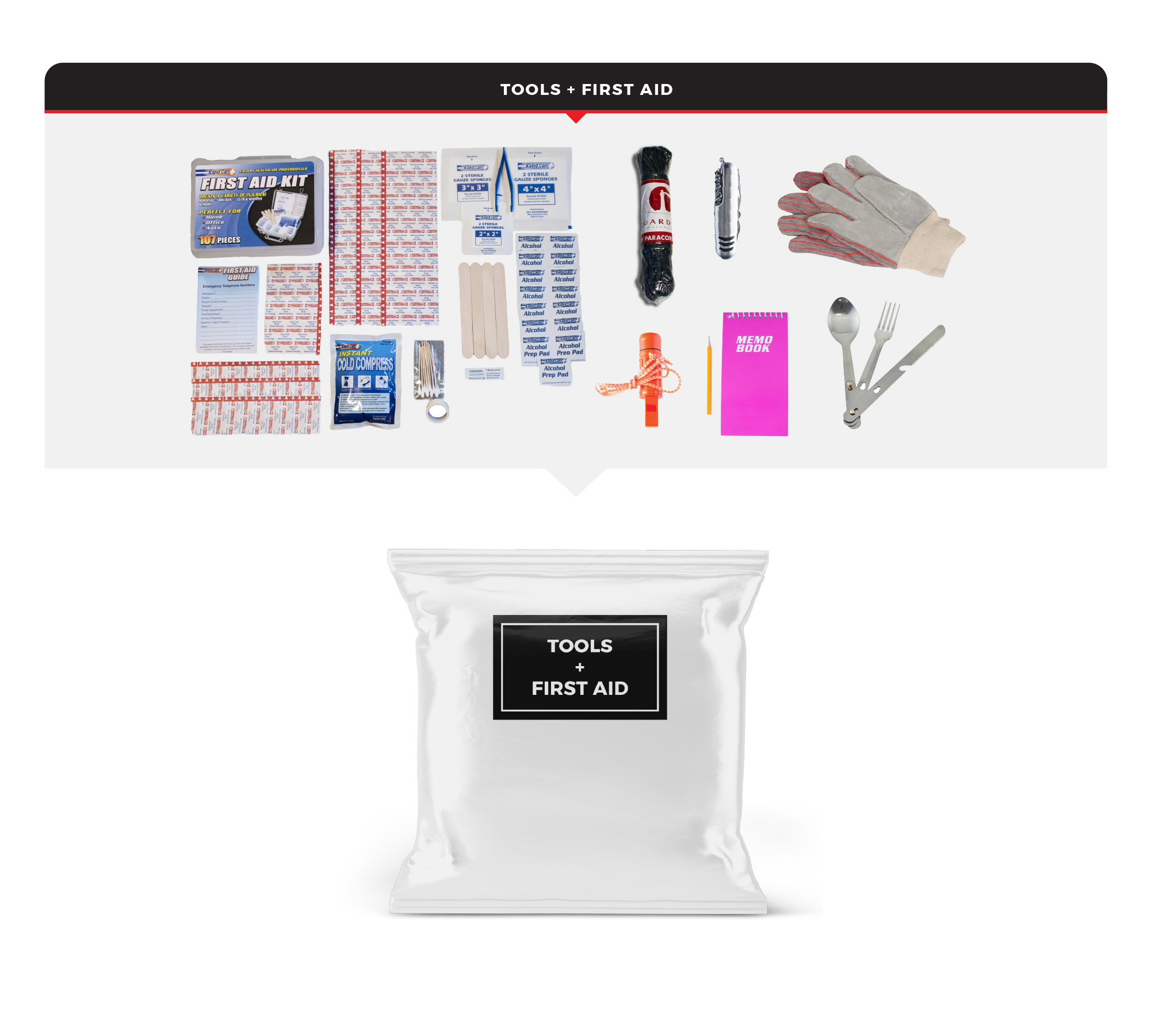 Tools and First Aid: These tools can be useful when you need help with navigation, transport, personal protection, or shelter. A  first aid kit can be used to treat minor injuries and protect against more serious health threats in a disaster.