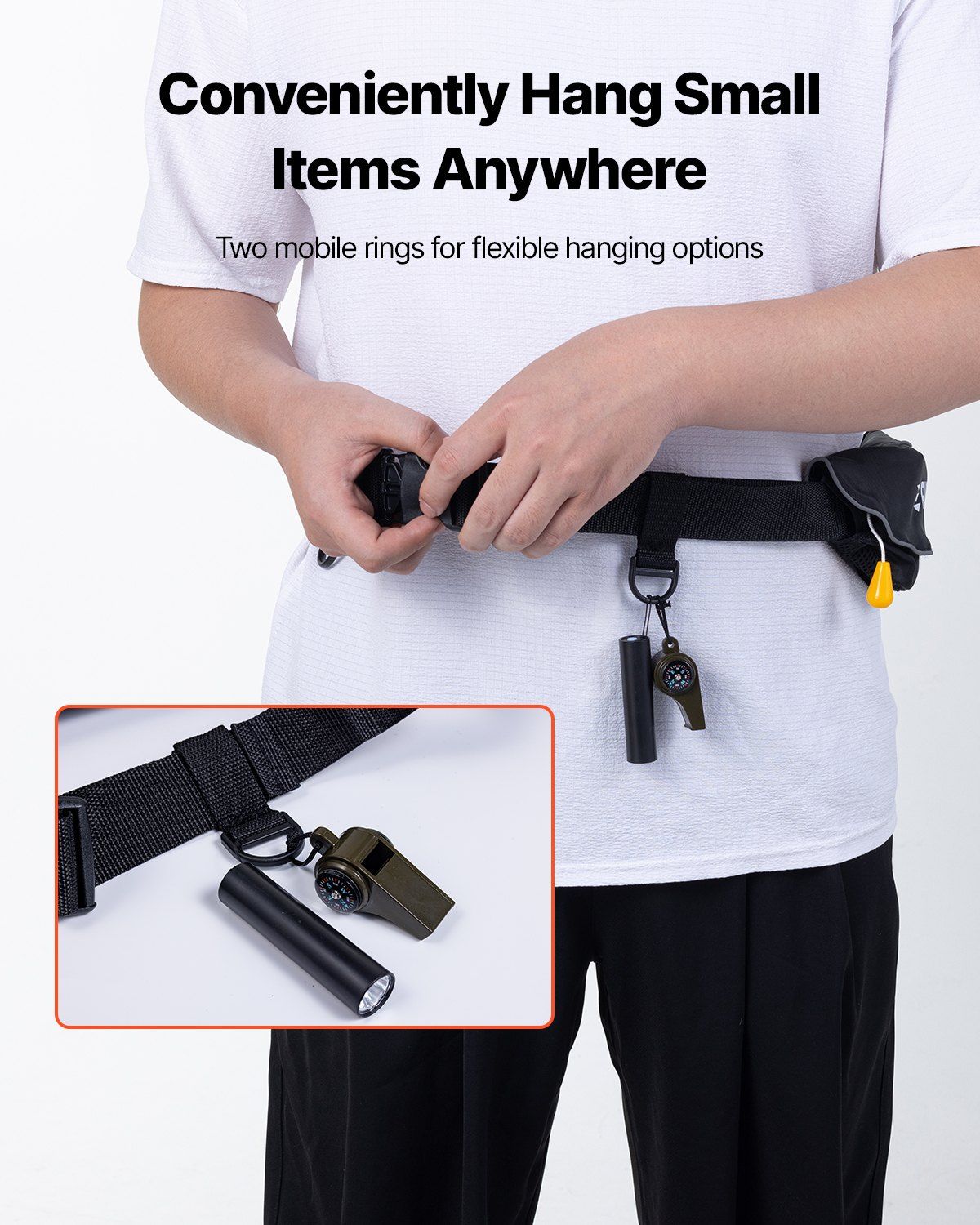 4.D-Ring for Easy Gear Attachment: Equipped with two movable D-rings, this inflatable belt pack allows you to easily attach essential security items such as a whistle, flashlight, or other rescue gear. Keep your vital equipment within reach, enhancing your security during any water adventure