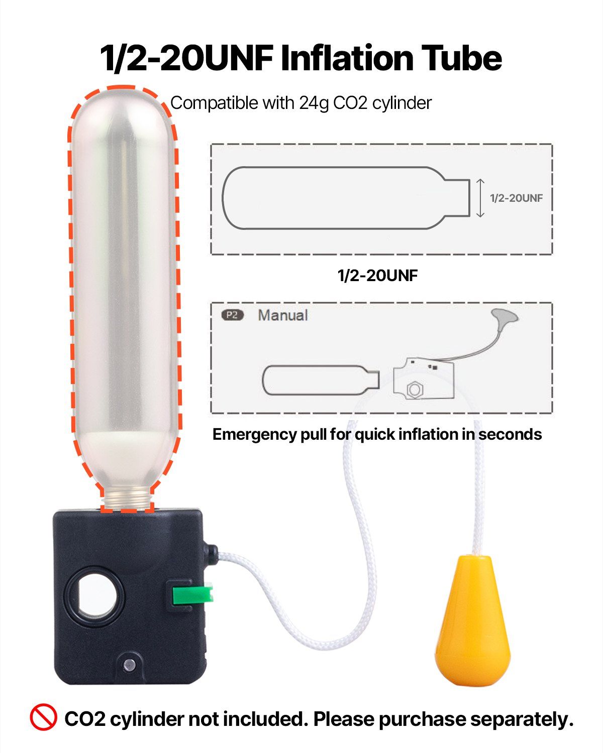 1.Surround 105N High Buoyancy: Pull the cord to quickly inflate the inflatable belt pack, providing 100N of buoyancy. The buoyancy can reach 105N after secondary oral inflation. The surround buoyancy airbag brings even buoyant support without pulling it over your head for easier use. Note: CO2 cylinder not included. Please purchase and install a compatible 24g CO2 cylinder with a 1/2-20UNF threaded inflation valve