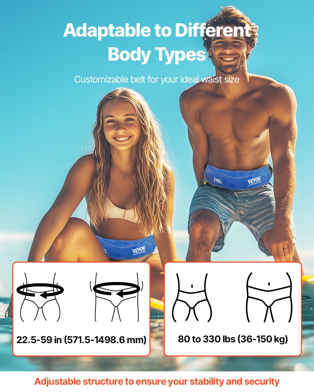 3.Customizable to Fit All Body Types: Our inflatable belt waist pack ensures a secure and snug fit for users of various body shapes and sizes. It comfortably fits individuals weighing 80-330 lbs (36-150 kg) with waist sizes ranging from 22.5-59 in (571.5-1498.6 mm). Enjoy a personalized fit for unmatched comfort and security during all your water activities